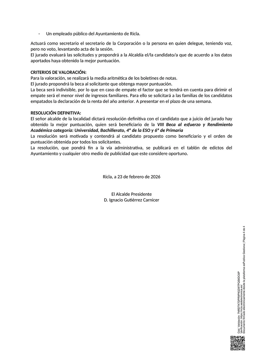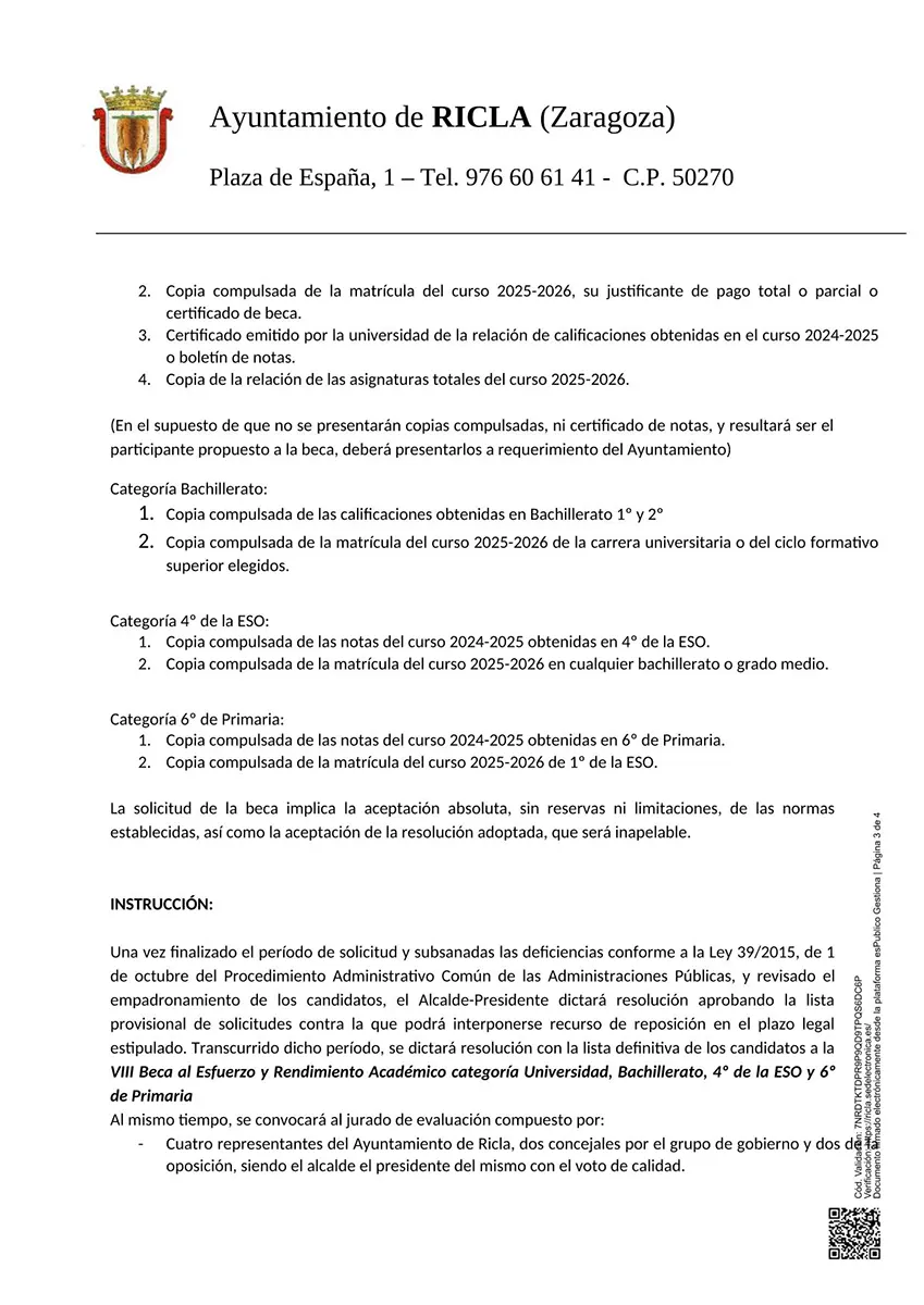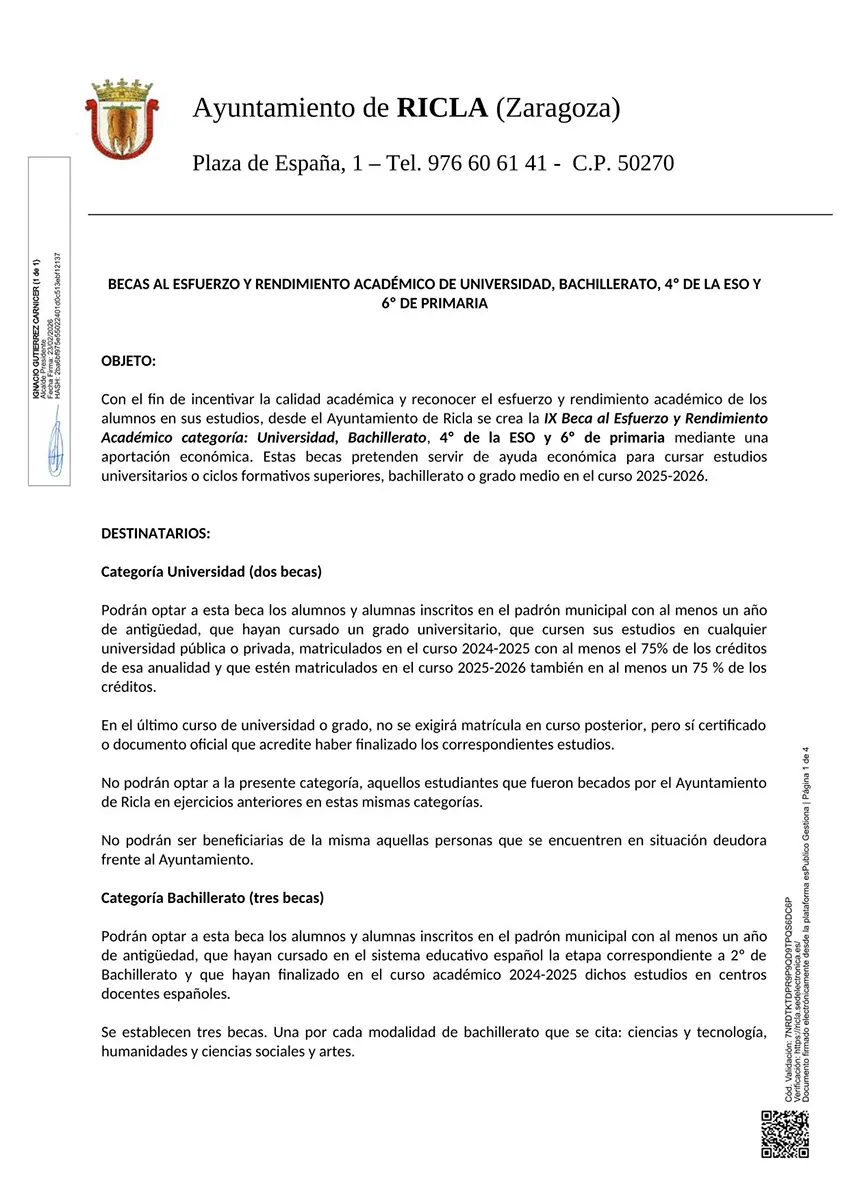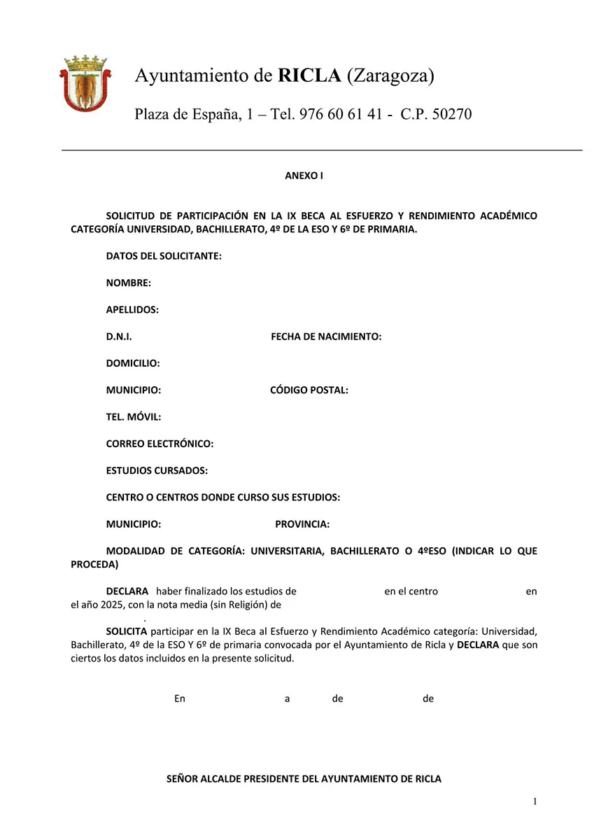 El Ayuntamiento de Ricla informa de que con el fin de incentivar la calidad académica y reconocer el esfuerzo y rendimiento académico se vuelven a crear las Becas al Esfuerzo y Rendimiento en las categorías de Universidad (2), Bachillerato (3), 4º de La Eso (1) y 6º de Primaria (1).